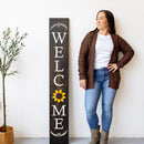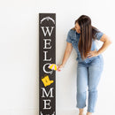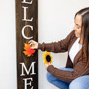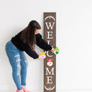 Our welcome signs are made out of solid pine hardwood, sanded, stained and sealed by hand with your choice of brown, black or grey stain. They measure 5 feet tall by 9.25 inches wide. The letters are laser cut from solid white acrylic. They come with 2 inserts of your choice as the interchangeable “O”.