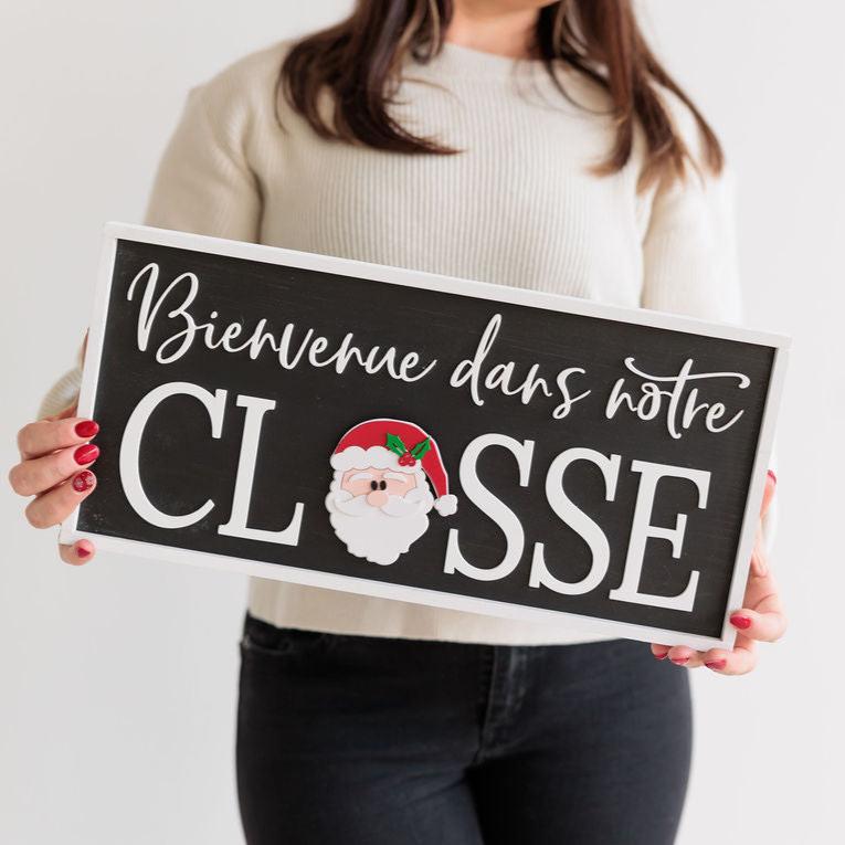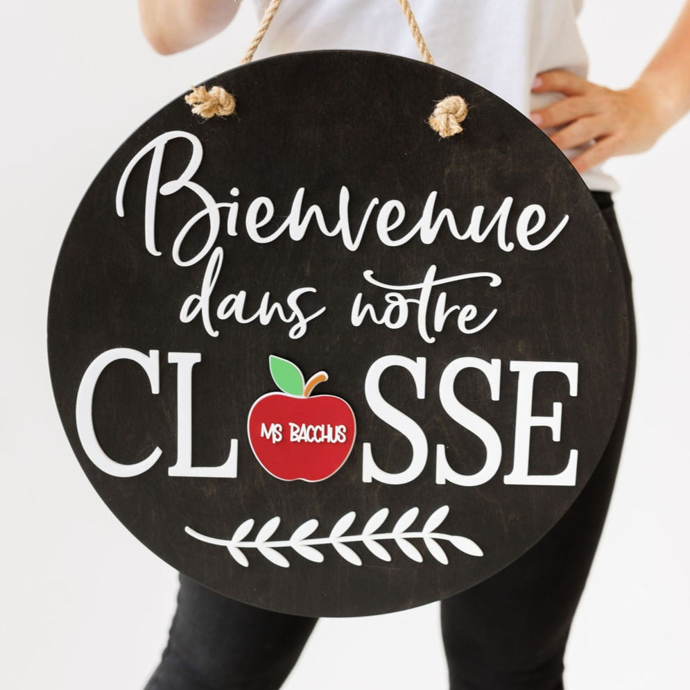 Our rectangle 16" interchangeable Bienvenue dans notre Classe Signs are made out of solid wood, sanded, stained and framed by hand with your choice of brown, black or grey stain. They measure 7.15x16". The letters are laser cut...