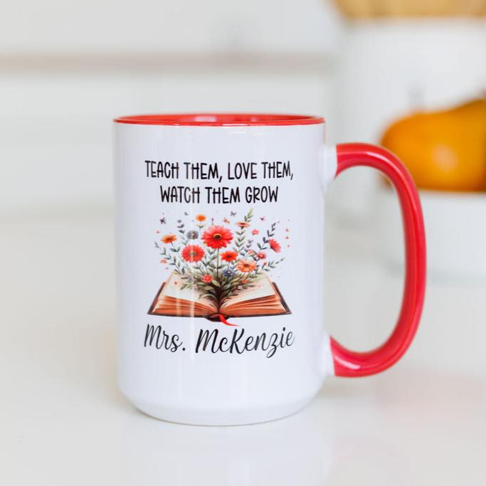 This personalized educator mug comes custom with the teacher's name under the image of the books as shown below. Please place the name you'd like included in the notes section when ordering.